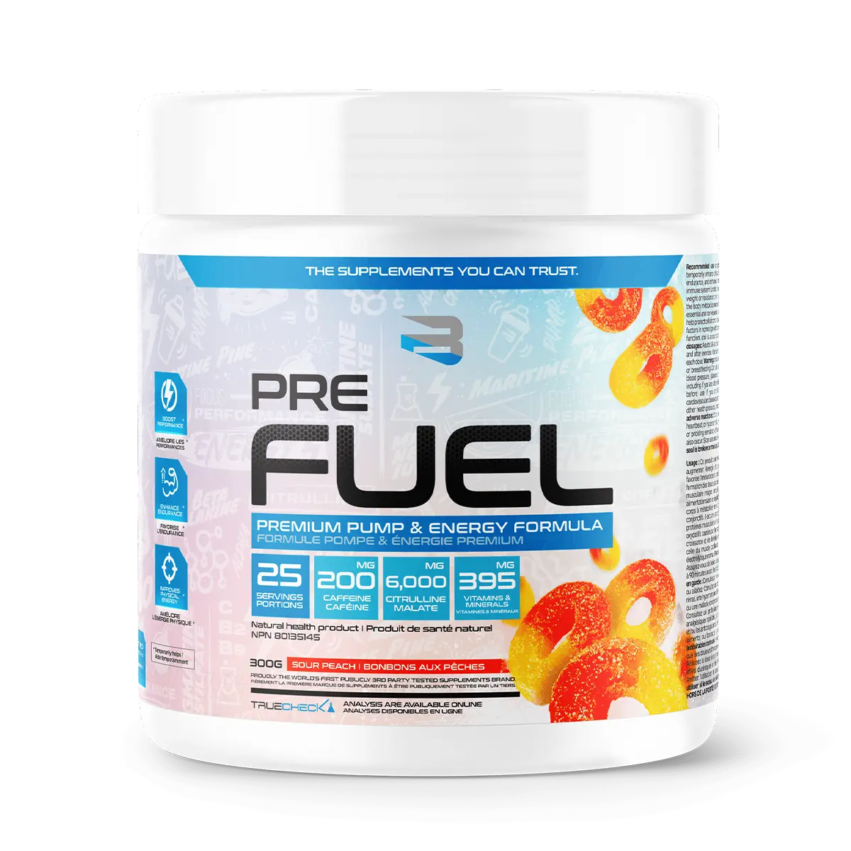 Pre-Fuel de Believe est un pré-workout québécois conçu pour optimiser tes entraînements. Avec 200 mg de caféine, de l’Alpha-GPC pour la concentration et des ingrédients comme la citrulline et la bêta-alanine pour la pompe musculaire, il offre un équilibre parfait entre énergie, focus et performance. Enrichi en vitamines et minéraux, il soutient aussi ta récupération.